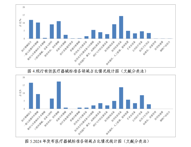 按《中*標(biāo)準(zhǔn)文獻(xiàn)分類法》分類統(tǒng)計,現(xiàn)行有效醫(yī)療器械標(biāo)準(zhǔn)覆蓋了醫(yī)療器械各技術(shù)領(lǐng)域,主要集中在醫(yī)用化驗設(shè)備C44(占比14.4%),醫(yī)療器械綜合C30(占比11.9%),矯形外科、骨科器械C35(占比11.1%),一般與顯微外科器械C31(占比10.2%);2024年發(fā)布標(biāo)準(zhǔn)覆蓋醫(yī)療器械綜合C30、矯形外科、骨科器械C35等16個標(biāo)準(zhǔn)類別,矯形外科、骨科器械類標(biāo)準(zhǔn)發(fā)布數(shù)量*多,占比達(dá)到當(dāng)年發(fā)布標(biāo)準(zhǔn)的17.3%。各領(lǐng)域標(biāo)準(zhǔn)占比分布見圖4—5。